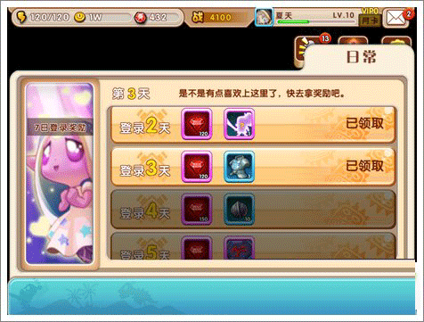 连续登录7天,每一天都会有相应的钻石奖励搭配其他奖励,而且越往后奖励越丰盛哦!