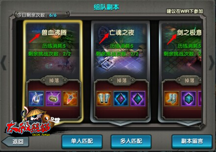 当玩家们等级达到15级时,就可以获得进入团队副本的资格了,可以在任意主城通过点击“历练”->“组队副本”转入组队副本界面。当然,进入之前,玩家需要做好万全准备,包括携带武神的挑选和装备的升级等,如果在副本中死亡可是得不偿失哦!