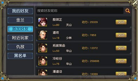 2.两名都有金兰空位的玩家可以互相添加称为金兰;金兰间比普通好友更加亲密,可以互赠人气礼品或红包;