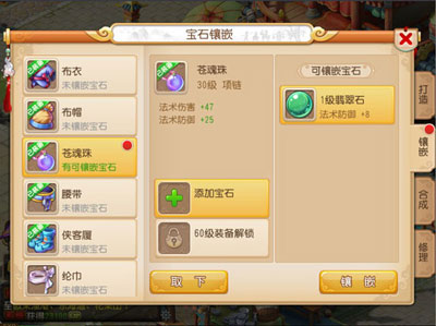 镶嵌宝石能让你的装备更为强大,不同部位的装备可以镶嵌不同类型的宝石。当你的装备达到30级之后,可以给你的装备镶嵌第一颗宝石;当你的装备达到60级的时候,可以镶嵌第二颗宝石;高等级的装备可以镶嵌更高级的宝石。