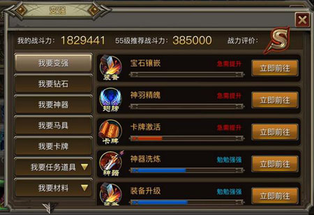 等级、技能不必多说,装备需要通过升级、升阶和宝石镶嵌提升。其中宝石较难获得,高等级的宝石可以通过低等级的宝石合成获得,每3颗同等级宝石可以合成为1颗更高级的宝石(例如:3颗1级宝石可合成为1颗2级宝石),高等级的宝石加成的属性效果将大幅度提升。宝石可以通过勇士之塔黑市兑换、商城购买获得。