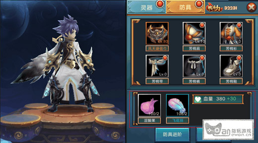 当防具功能开启之后,玩家自动拥有六件防具——巾、肩、衫、带、裤、鞋,防具初始都是1级白色品质,随着玩家对防具不断升级、进阶,最终每件防具都能达到80级橙色品质。