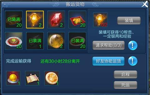 单人限时任务,通过装填货物获取帮贡,银两和经验,是获取帮贡的主要途径。