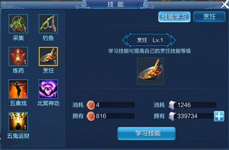 技能学习:消耗帮贡、银两或银票。