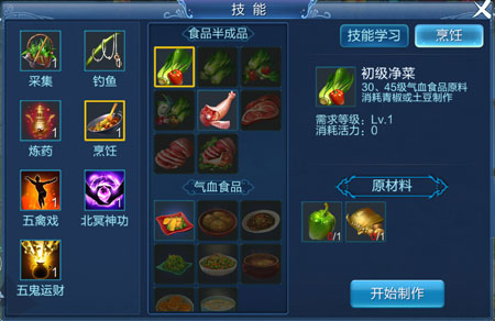 食品制作:点击烹饪图标,在右侧物品框中选择要合成的食品,点击开始制作弹出制作窗。输入要制作的组数,每组10个食品。点击烹饪,生产相应食品。