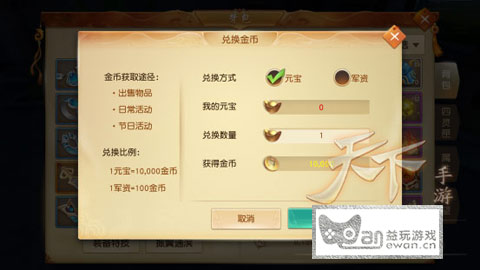 兑换:进行元宝兑换,1元宝=10000金币(这都是有钱人玩的,个人不推荐,1万并不能干什么)