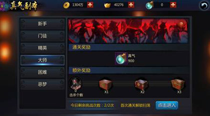 真气副本:在规定时间内消灭副本内的怪物,BOSS会重生两次,全部击杀才算通关