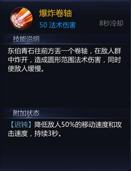 1、爆炸卷轴:东伯雪鹰为了保护弟弟,为他准备了很多卷轴,丢出去即可,对敌人造成减速效果。