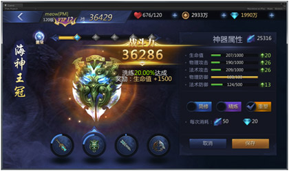 从界面上看,解锁神器后可以对神器进行养成操作,养成的方式有三种:花费源石的简修、消耗源石和金币的精炼、花费宝石的重塑。选择任何一种方式进行养成都可以获得属性的提升,满意的话选择保存就行了,而且保存后的战斗力加成是对所有伙伴都有效的!
