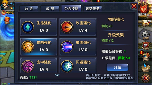 所谓“公会技能”,必定是要加入公会后才可以开启的。公会技能的强化,与公会等级有关,只消耗公会贡献。简而言之,公会技能的“性价比”非常高,实属“强化界”的一大免费的午餐。