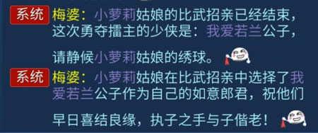 3.报名招亲需向梅婆缴纳一定报名订金成功报名比武招亲后,系统将广播你报名了比武招亲的消息,并说明本场比武招亲开启的具体时间。